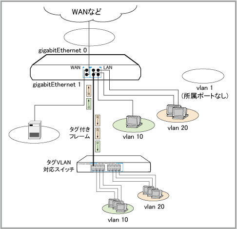 | vlan 10、vlan 20宛てのフレームをタグ付きで出力する。VLANタグにはVLAN ID(10か20)を格納する。ネイティブVLAN(vlan 1)宛てのフレームはタグなしで出力する | |||