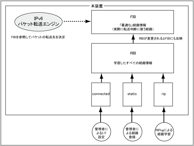 RIPngのルーティングプロセスは、RIB/FIBとは別に独自の経路表を保持しています。ここでは、これらをRIPng経路表と呼ぶことにします。