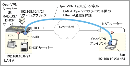 NoteAndroid版およびiOS版クライアントではTap(L2)モードでのOpenVPN接続が未サポートのため、本構成は使用できません。