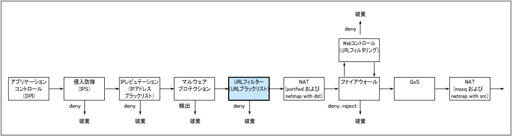 NoteHTTPSの通信では暗号化されたTLSセッション上でHTTPリクエストが送信されるため、アクセス先URLそのものを検査することはできません。ただし通常、TLSセッション開始時のClientHelloメッセージには接続先サーバーのドメイン名がSNIとして含まれるため、HTTPS通信に対してはこのドメイン名の情報を利用して処理を行います。