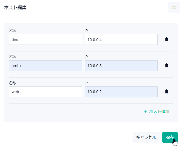 | ホスト追加 | ホスト情報の入力欄(「名称」と「IP」)を追加します |