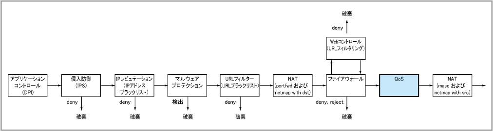 Note出力インターフェースではパケットの分類に基づくマーキングと帯域制御/優先制御が可能です。ブリッジングパケットは初期設定では本機能の適用対象外ですが、ソフトウェアブリッジに l3-filtering enableを設定している場合は、該当ソフトウェアブリッジでブリッジされるL3トラフィックに対して本機能が適用されるようになります。