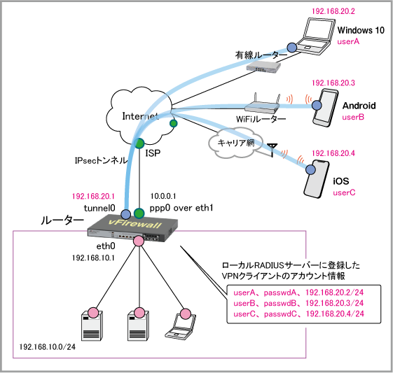 | ユーザーA | userA | passwdA | 192.168.20.2/24 |