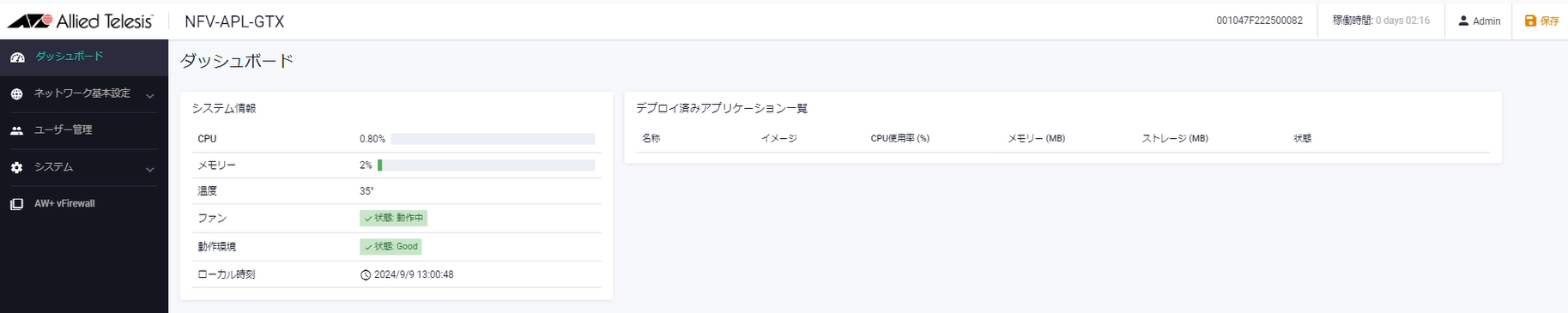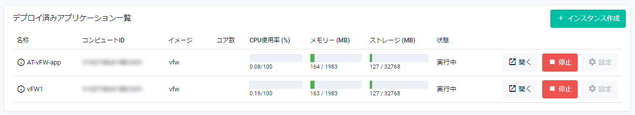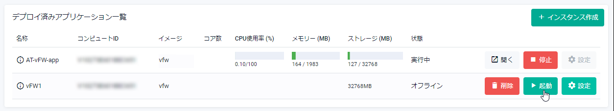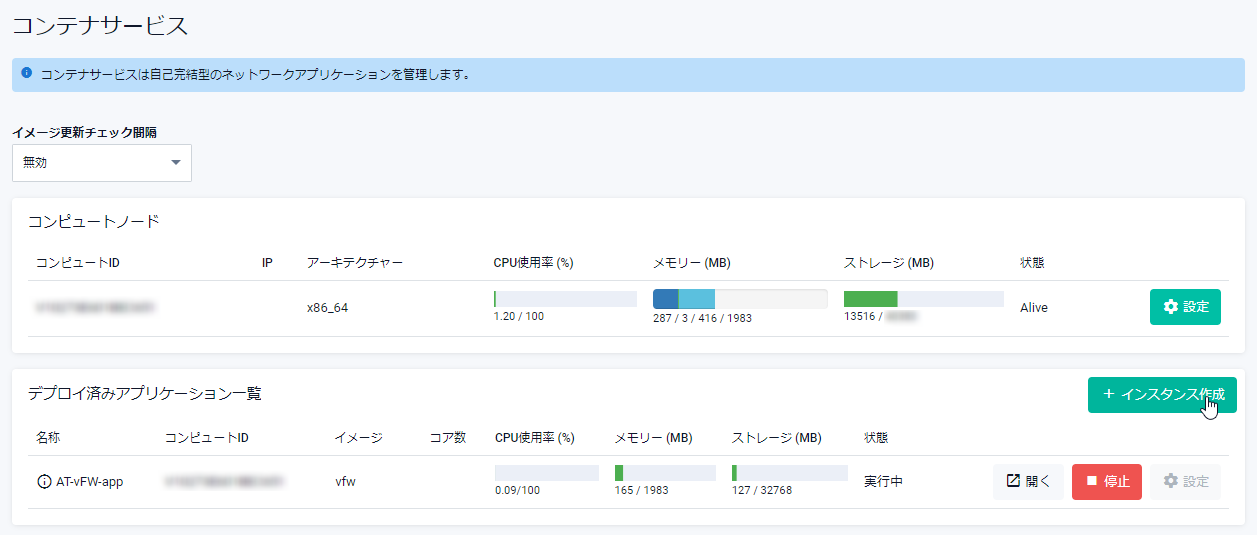 NotevFirewallアプリケーションインスタンスの作成は2つの画面から行えます。アプリケーションインスタンスの作成やバージョン更新を行う際は、あらかじめ不要なファイルを削除し、「ファイル管理」画面の「フラッシュメモリー使用量」でストレージに空きがあることを確認してください。