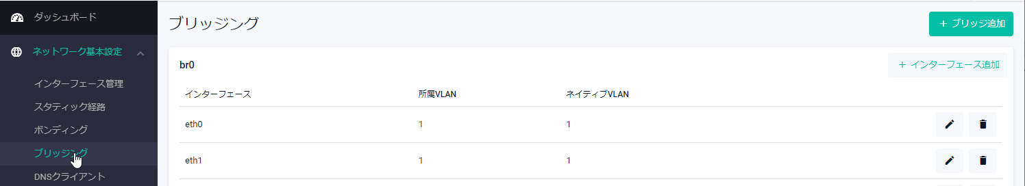 | ブリッジ | ソフトウェアブリッジにより全ポートがvlan1にブリッジ接続(レイヤー2接続)されています |