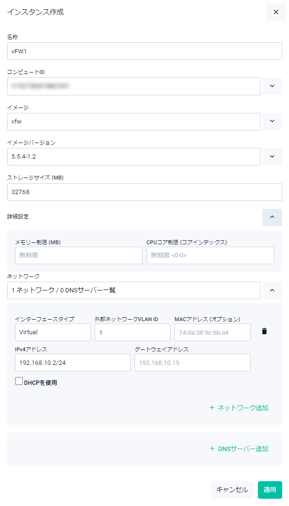 | IPv4アドレス | 指定不要(vFirewall側で設定するため) | 未設定 |
