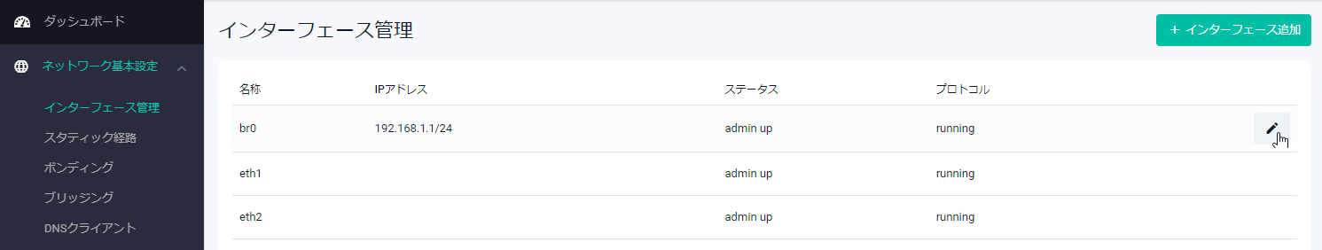 NoteAT-NFV-APLのGUI設定画面からvFirewallのWeb GUIにアクセスするための「開く」ボタンでは、vFirewallのeth0インターフェースに設定されているIPアドレスを管理用IPアドレスだと仮定しています。そのため、特に理由がない限り、最初に設定するインターフェースに管理用のIPアドレスを設定するようにしてください。