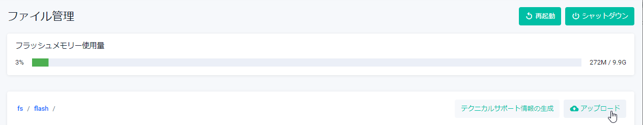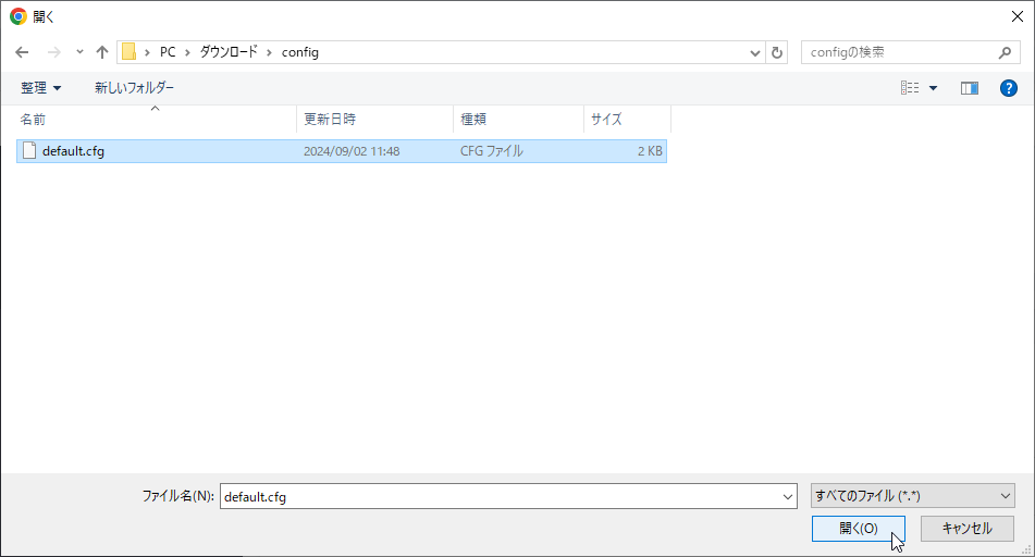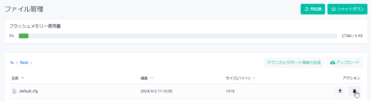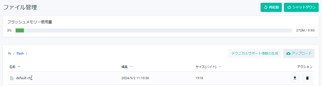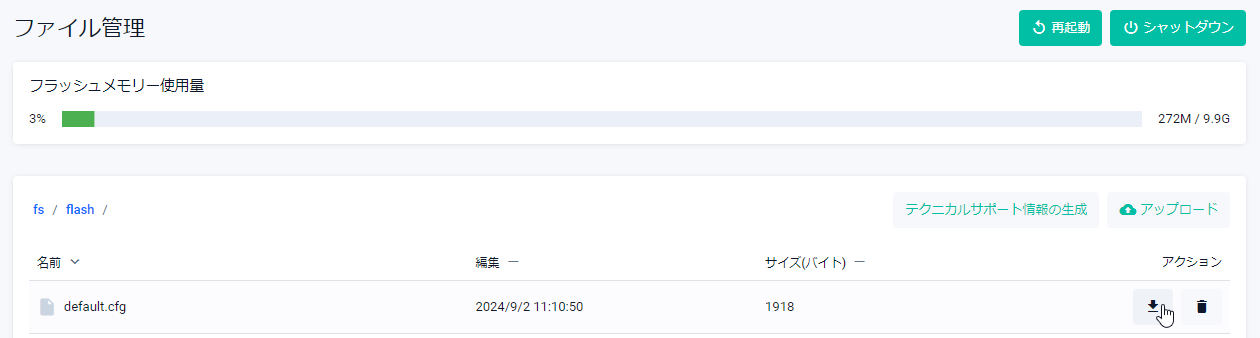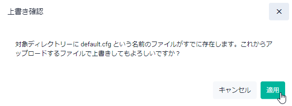 Note「保存」ボタンがオレンジ色に変わりますが、クリックしないでください。上記手順でアップロードした「default.cfg」ファイルの設定内容が、「保存」ボタンをクリックした時点の設定内容に上書きされます。