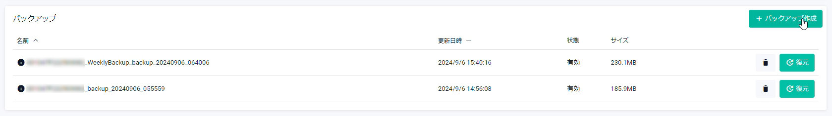 | バックアップ先の推定必要容量 | バックアップ保持数を加味して計算されたUSBメモリーに必要な容量の推定値です。実際に作成されるサイズとは異なります。 バックアップ対象のアプリケーションが実行中の場合は、実際に使用されているストレージサイズをもとに算出されます。 停止済みの場合は、作成時に割り当てたストレージサイズをもとに算出されるため、実際に必要な容量とは大きく異なることがあります |