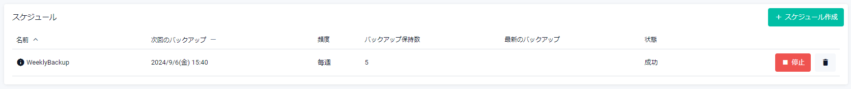 | バックアップ保持数 | 本スケジュールによって作成されたバックアップファイルを最新の何個まで保持するかを指定します |