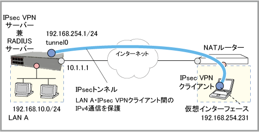 以下では、上記構成図のルーターAを例に、IPsec VPNクライアントからのリモートアクセス接続を受け入れるIPsec VPNサーバーを構築するための具体的な設定手順を示します。