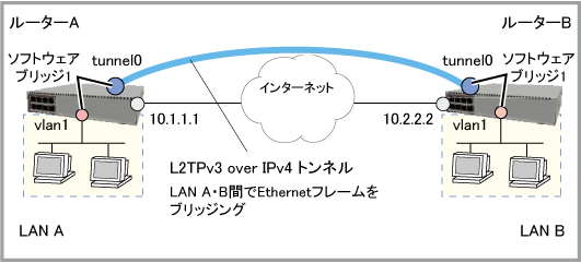 IPv4ネットワーク上にL2TPv3トンネルインターフェースを作成し、ルーターA、ルーターB配下のeth0同士をリモートブリッジ接続し、Ethernetフレームのブリッジングを行うには、次の手順にしたがいます。