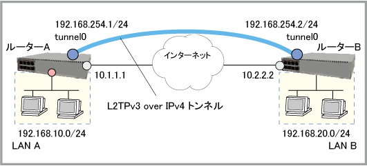 IPv4ネットワーク上にL2TPv3トンネルインターフェースを作成し、ルーターA、ルーターB配下のeth0同士をL3接続するには、次の手順にしたがいます。