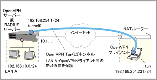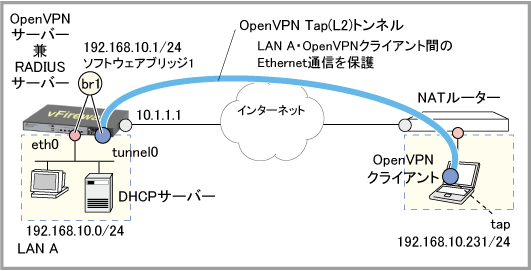 NoteAndroid版およびiOS版クライアントではTap(L2)モードでのOpenVPN接続が未サポートのため、本構成は使用できません。