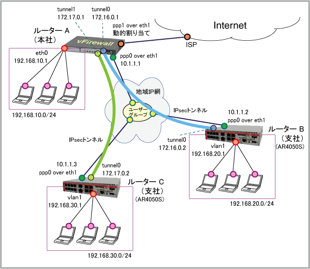 | WAN側(ppp0)IPアドレス | 10.1.1.1/32 | 10.1.1.2/32 | 10.1.1.3/32 |