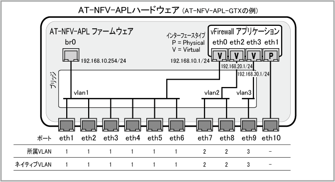 Note10ポート構成(eth1~eth10)のAT-NFV-APL-GTXを想定した例になっていますので、6ポート(eth1~eth6)構成のAT-NFV-APL-GTをご使用の場合は、使用するポートを適宜読み替えてください。