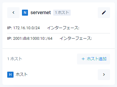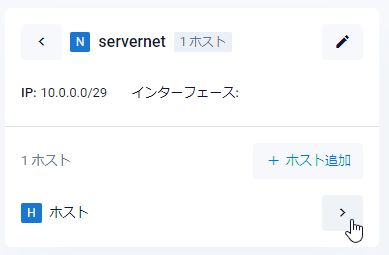 | (N) servernet Xホスト > | ゾーンに所属するネットワークの名前(例ではservername)と該当ネットワークに所属するホストの数(X)が表示されます。右向き矢印をクリックすると、該当ネットワークの情報に表示が切り替わります。 |
