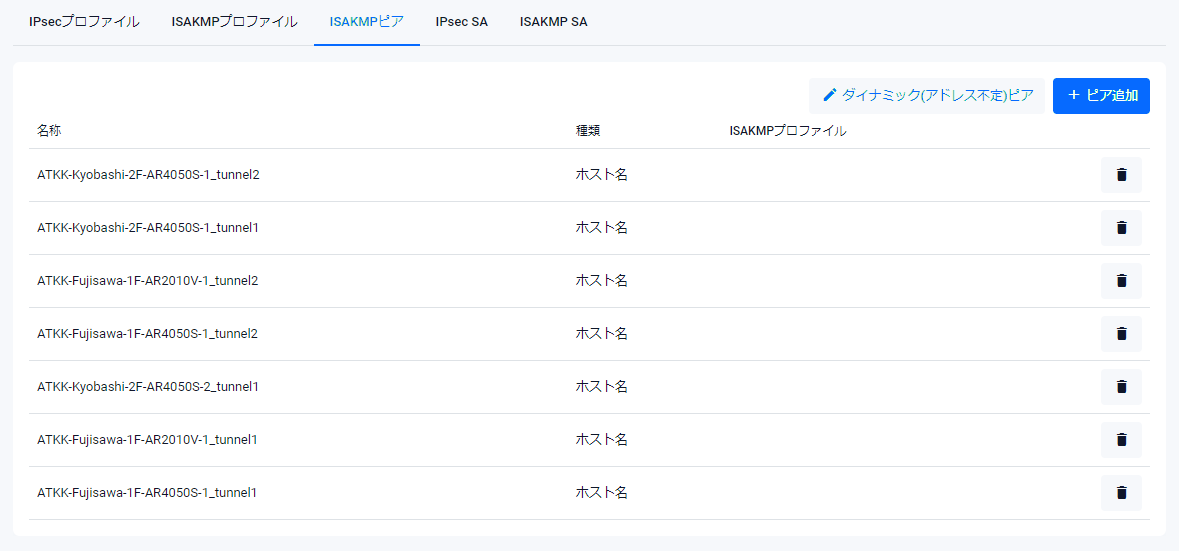 | 削除ボタン | ISAKMPピアとISAKMPプロファイルの関連付けを削除します。削除前には確認のダイアログが表示されます |