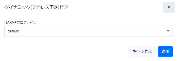 | 適用ボタン | IPアドレスが不定なピアとISAKMPプロファイルの関連付けを行い一覧画面に戻ります |