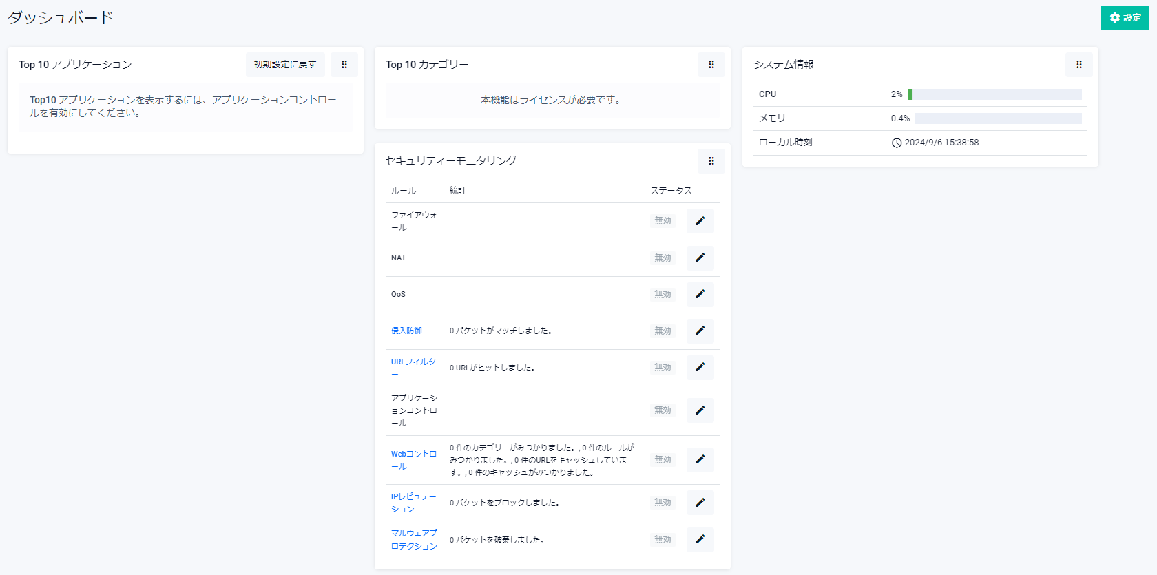 ログイン直後は、Web GUIのホーム画面であるダッシュボード画面が表示されます。