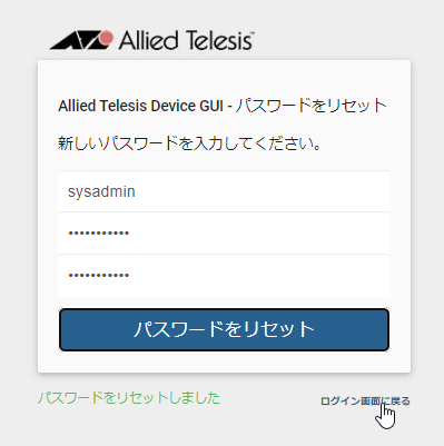 「パスワードをリセットしました」と表示されたら「ログイン画面に戻る」をクリックし、新しいパスワードでログインします。