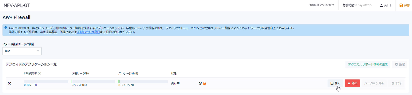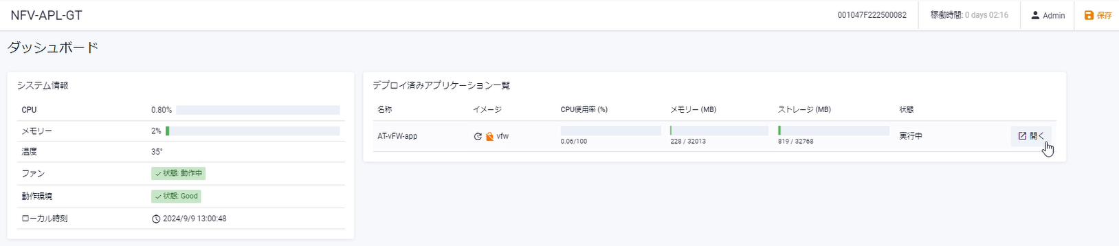 AT-NFV-APLのダッシュボード画面で、「AT-vFW-app」の「開く」ボタンをクリックする