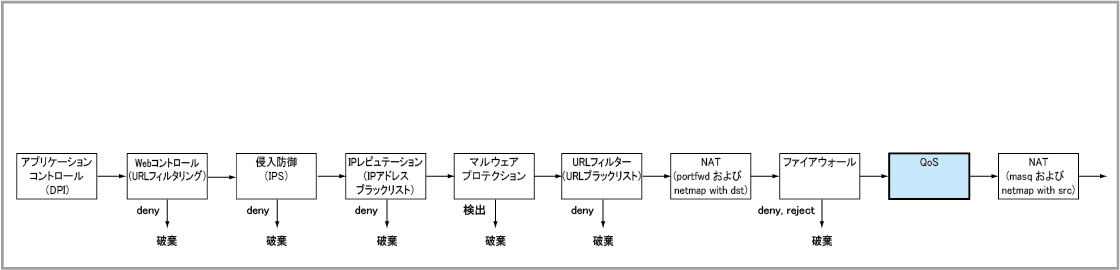 Note出力インターフェースではパケットの分類に基づくマーキングと帯域制御/優先制御が可能です。ブリッジングパケットは初期設定では本機能の適用対象外ですが、ソフトウェアブリッジに l3-filtering enableを設定している場合は、該当ソフトウェアブリッジでブリッジされるL3トラフィックに対して本機能が適用されるようになります。