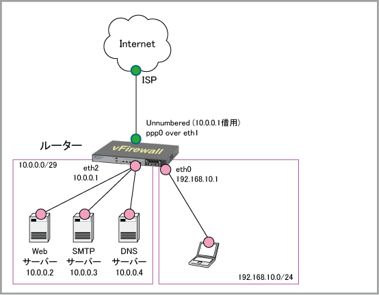 この例では、LAN側を2つのサブネットに分割し、一方をグローバルアドレスで運用するサーバー用(DMZ)、もう一方をプライベートアドレスで運用するクライアント用とします。クライアントはダイナミックENAT経由でインターネットにアクセスします。