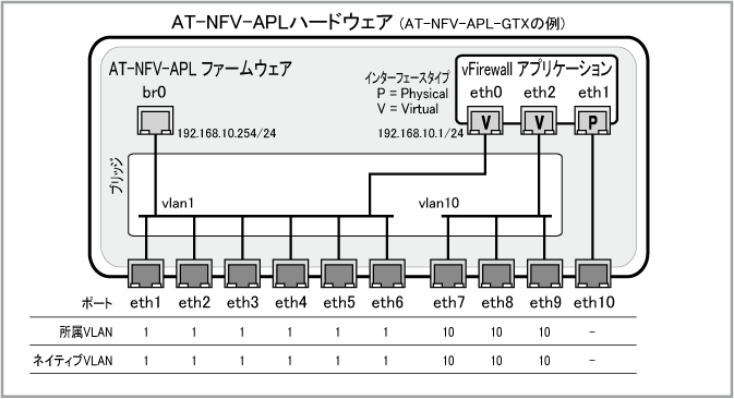10ポート構成(eth1~eth10)のAT-NFV-APL-GTXを想定した例になっていますので、6ポート(eth1~eth6)構成のAT-NFV-APL-GTをご使用の場合は、使用するポートを適宜読み替えてください。