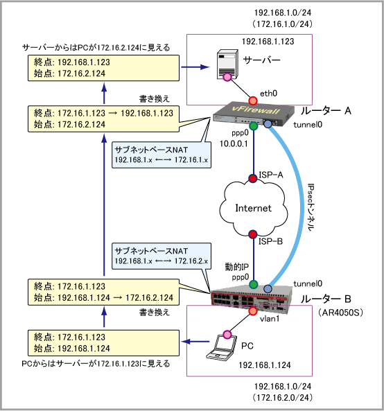 | LAN側(eth0)内部NAT後IPアドレス | 172.16.1.x/24 | 172.16.2.x/24 |