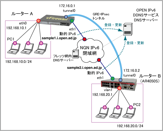 interface tunnel0 tunnel source eth1 tunnel destination sample2.i.open.ad.jp tunnel local name sample1.i.open.ad.jp tunnel remote name sample2.i.open.ad.jp tunnel protection ipsec tunnel mode gre ipv6 ip address 172.16.0.1/30 ip tcp adjust-mss 1366