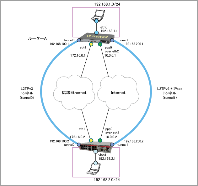 | L2TPv3トンネルIPアドレス(2) | 192.168.200.1/30 (tunnel1) | 192.168.200.2/30 (tunnel1) |