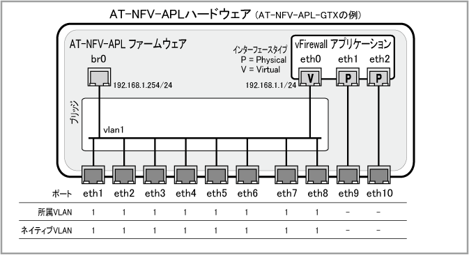 Note10ポート構成(eth1~eth10)のAT-NFV-APL-GTXを想定した例になっていますので、6ポート(eth1~eth6)構成のAT-NFV-APL-GTをご使用の場合は、使用するポートを適宜読み替えてください。