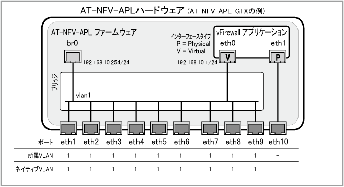 Note10ポート構成(eth1~eth10)のAT-NFV-APL-GTXを想定した例になっていますので、6ポート(eth1~eth6)構成のAT-NFV-APL-GTをご使用の場合は、使用するポートを適宜読み替えてください。