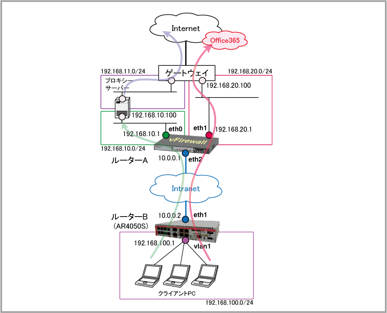 拠点側から外部への通信をセンター経由で行う構成において、センター側のルーターAでWebリダイレクト・プロキシーモードを使用し、拠点から外部への通信は原則としてプロキシーサーバーにリダイレクトしながら、Office365の通信だけは例外的にプロキシーサーバーを経由させず、ルーターAから直接ゲートウェイルーターに転送する設定例です。