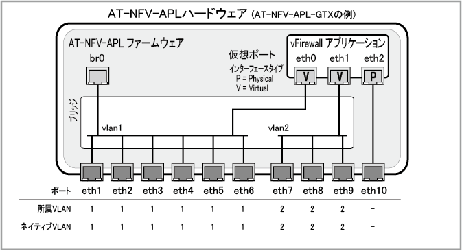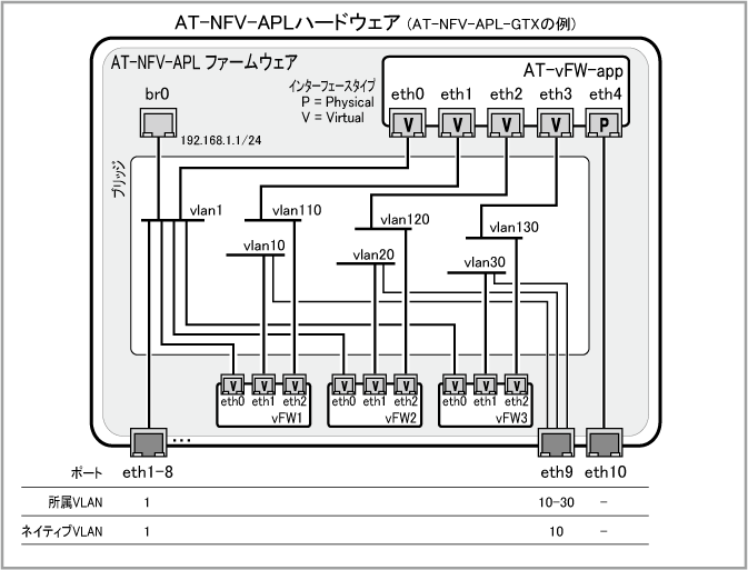 NotevFirewallアプリケーションのネットワーク設定は、AT-NFV-APL設定画面の 「AW+ vFirewall」メニュー、および、vFirewallアプリケーションの Web GUI や コマンドラインインターフェース(CLI)から行います。