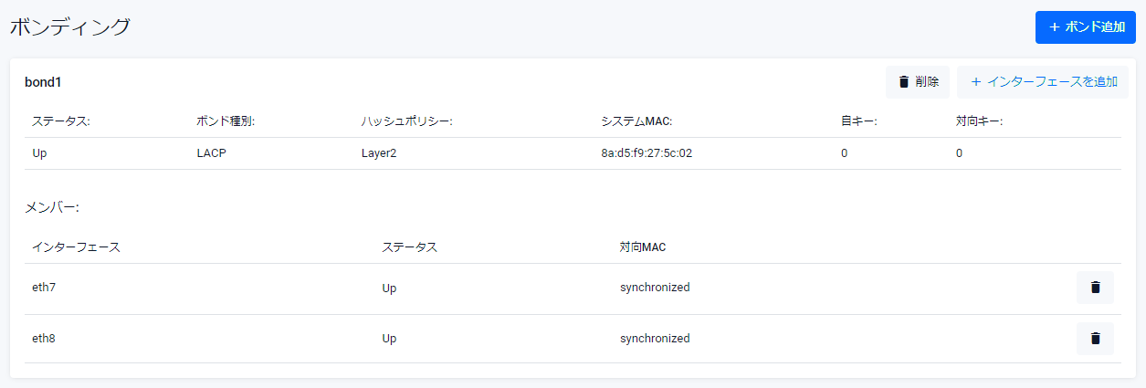 | ボンド種別 | ボンディング方式として「スタティック」または「LACP」が表示されます |