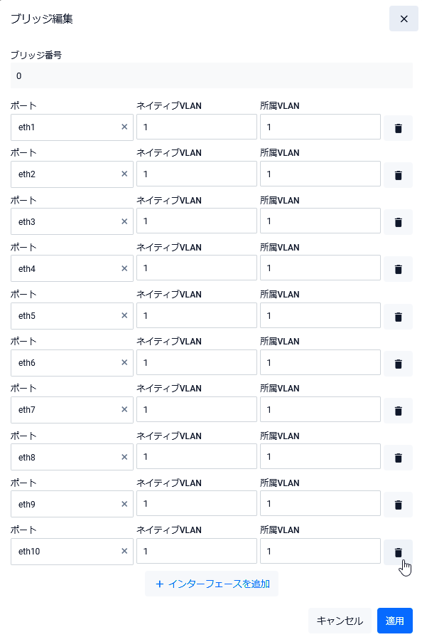 | 「インターフェースを追加」ボタン | ブリッジにポートを追加するときに使用します。入力欄が一行追加されるので、追加するポートを選択し、所属VLANとネイティブVLANを適宜入力してください。 |