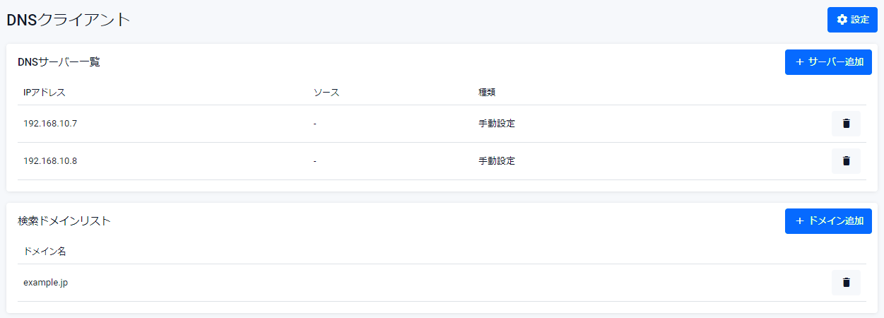 | 「削除」ボタン | DNSサーバーの登録を削除します。削除前には確認のダイアログが表示されます |