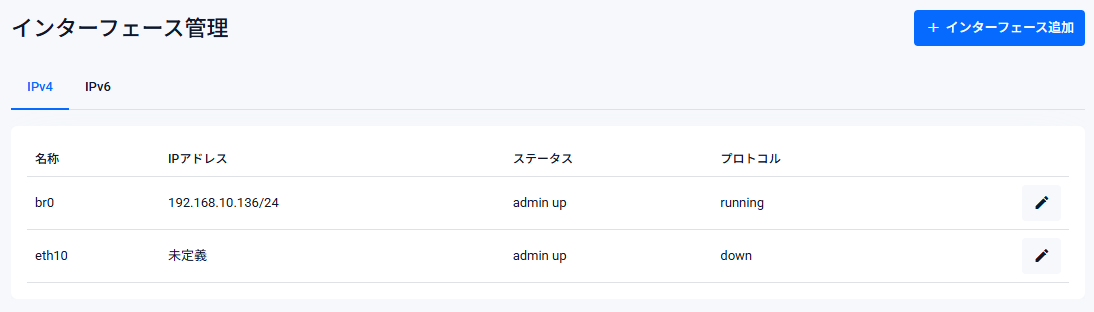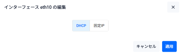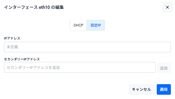| IPアドレス | 対象インターフェースに設定するプライマリーIPv4アドレスを「192.168.10.254/24」の形式で入力してください。空欄(未定義)の状態で「適用」ボタンを押した場合は該当インターフェースのIPv4アドレスが削除されます |