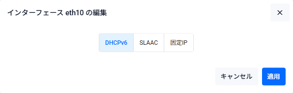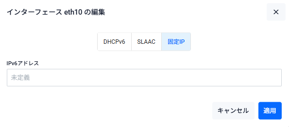 | IPv6アドレス | 対象インターフェースに設定するIPv6アドレスを「2001:db8:10::1/64」の形式で入力してください。空欄(未定義)の状態で「適用」ボタンを押した場合は該当インターフェースのIPv6アドレスが削除されます |
