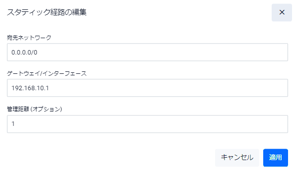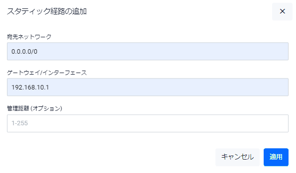 | 管理距離(オプション) | 経路エントリーの管理距離を入力してください。省略時はスタティック経路のデフォルト値である1となります |