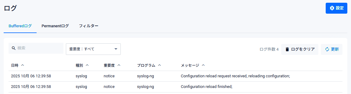 | 種別 | ログを「種別」でフィルターします。 各ログの種別はBufferedログタブ、Permanentログタブの「種別」欄で確認できます。 「all」を選択した場合はすべての種別が対象となります(すべてのログが「種別」条件に合致します)。 |