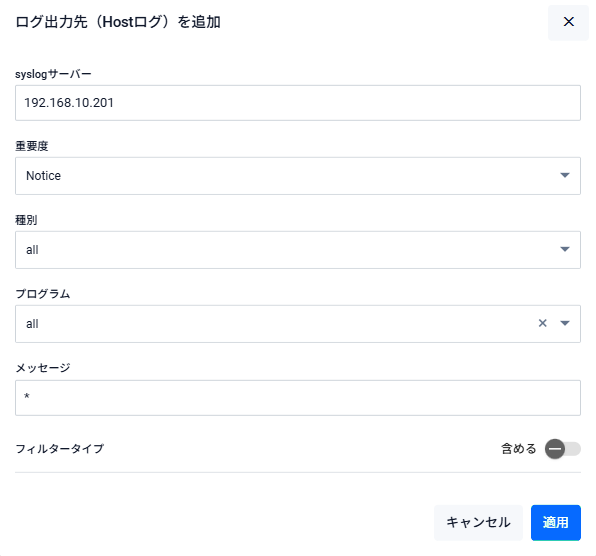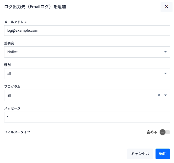 | フィルタータイプ | 4つの条件(重要度、種別、プログラム、メッセージ)を満たしたログに対するアクション(処理内容)を選択します。 条件を満たしたログを出力するにはデフォルトの「含める」を選択してください。 条件を満たしたログを出力対象から除外したい場合は「除外する」を選択します。 |