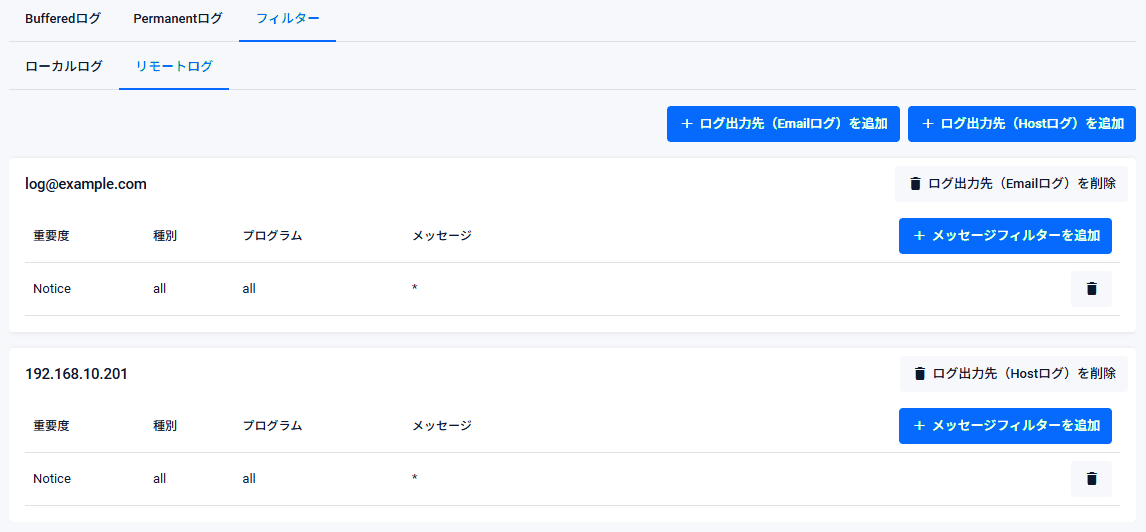 | 「ログ出力先(Hostログ)を追加」ボタン | ログのsyslog送信を設定する「ログ出力先(Hostログ)を追加」画面が開きます |