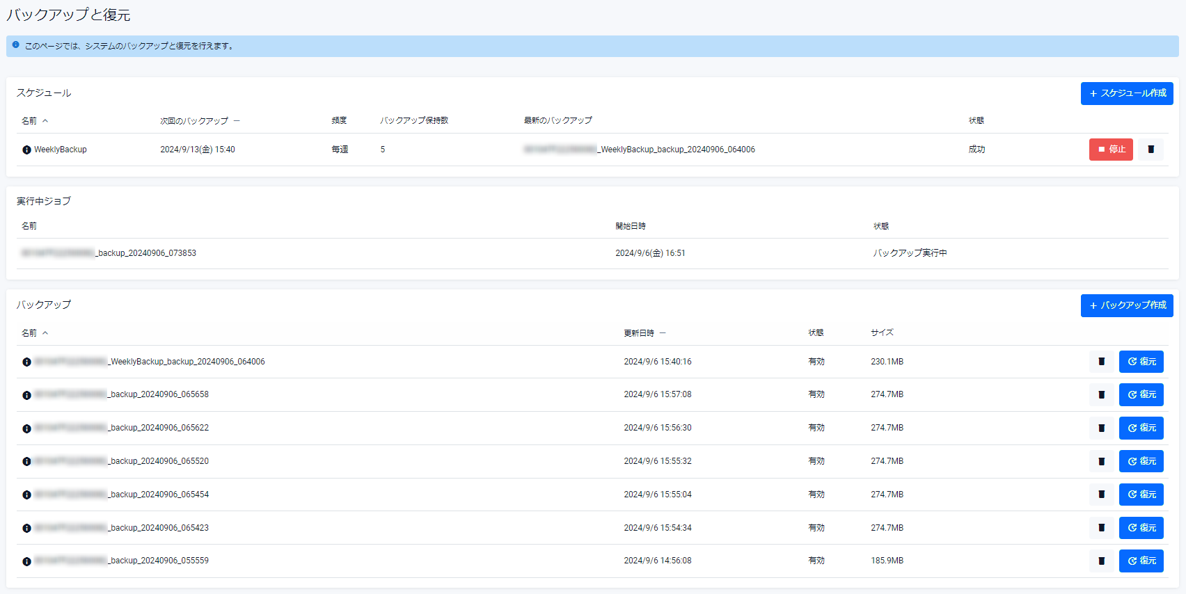 | スケジュール | 現在設定されているバックアップスケジュールの情報を表示します |