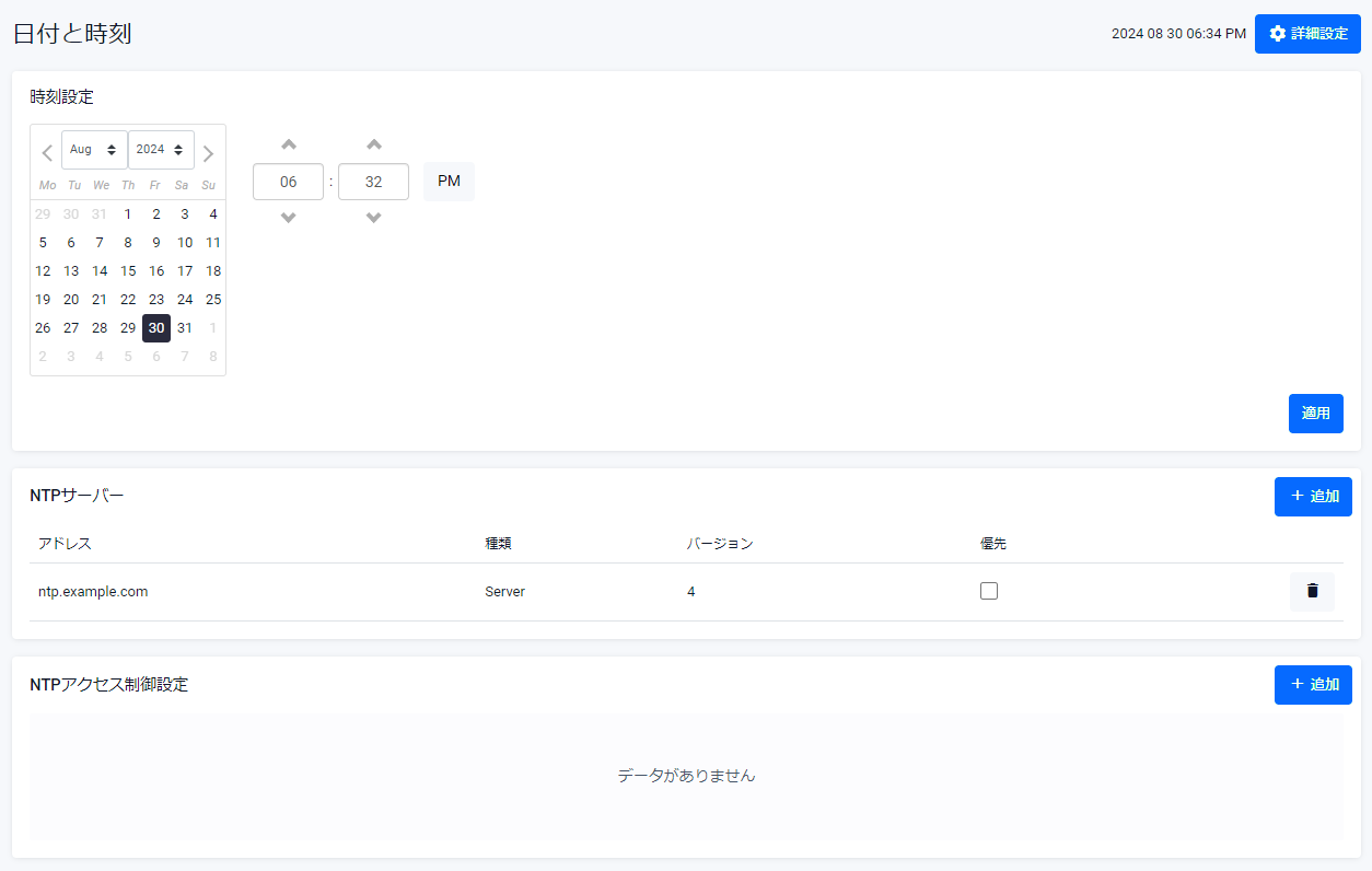 | 「適用」ボタン | NTPアクセス制御設定を追加して「日付と時刻」画面に戻ります |