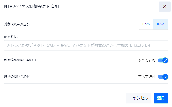 | NTPアクセス制御設定 | NTPアクセス制御設定の一覧が表示されます。「追加」ボタンを押すとNTPアクセス制御設定の追加を行うダイアログが表示されます。右端の削除ボタンを押すと該当アクセス制御設定が削除されます |