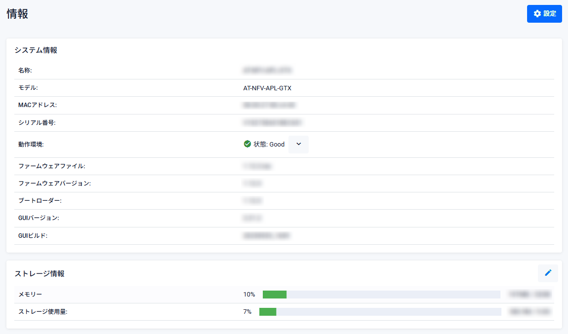| 外部メディア使用量 | AT-NFV-APLのUSBポートに接続したUSBメモリーの使用状況が表示されます。USBメモリー接続時のみ表示されます |