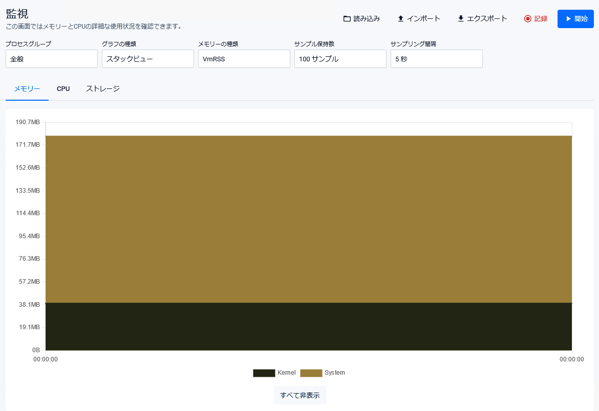 | 「開始」ボタン | サンプルの収集を開始します(ブラウザーのメモリー上に保持)。収集中は「サンプル保持数 × サンプリング間隔」の間、GUIタイムアウトが無効になります |
